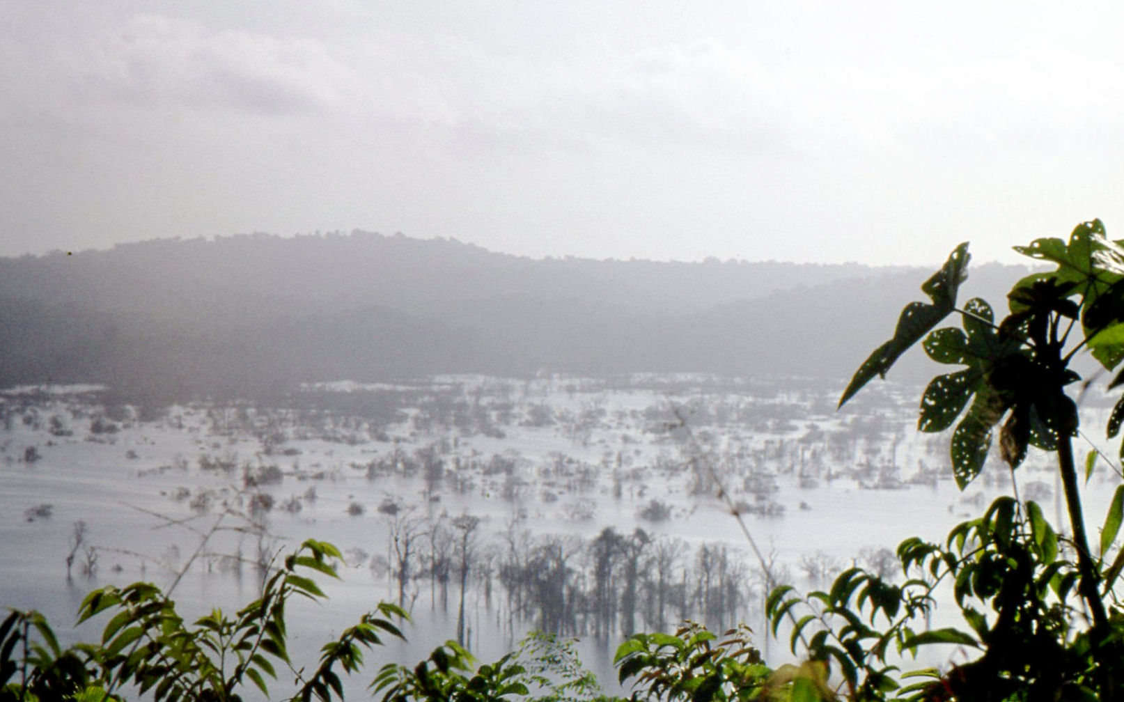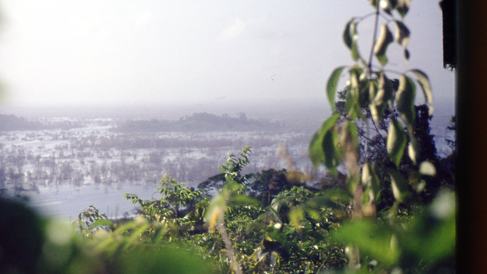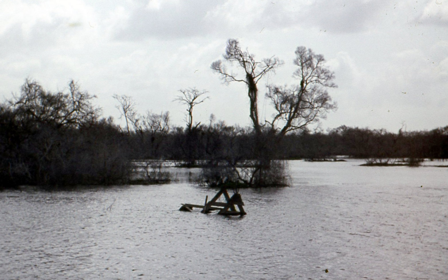 Alles is onder het water verdwenen, alleen de spits van het hoogste gebouw, de kerk komt nog boven het water uit.